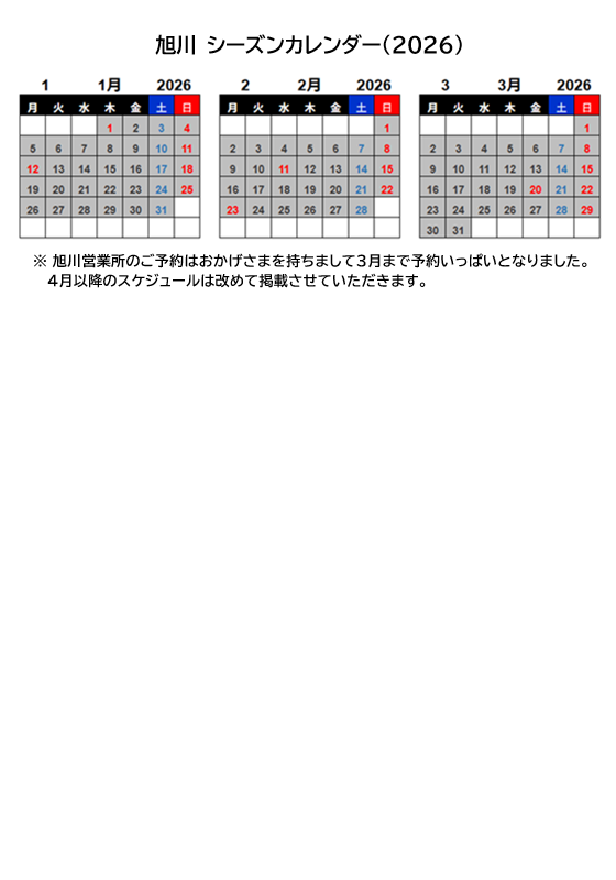重要旭川営業所:3月までご予約でいっぱいとなりました。